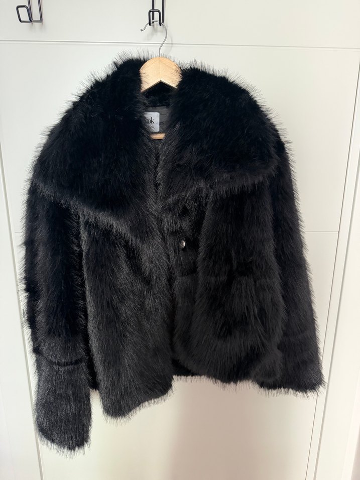 Siyah, kürk detaylı, notched lapel yakalı ve uzun kollu midi boy kadın mont. Rahat kesimi ve yumuşak, sıcak tutan kumaşıyla ofis için uygundur. Hiç giyilmedi.
