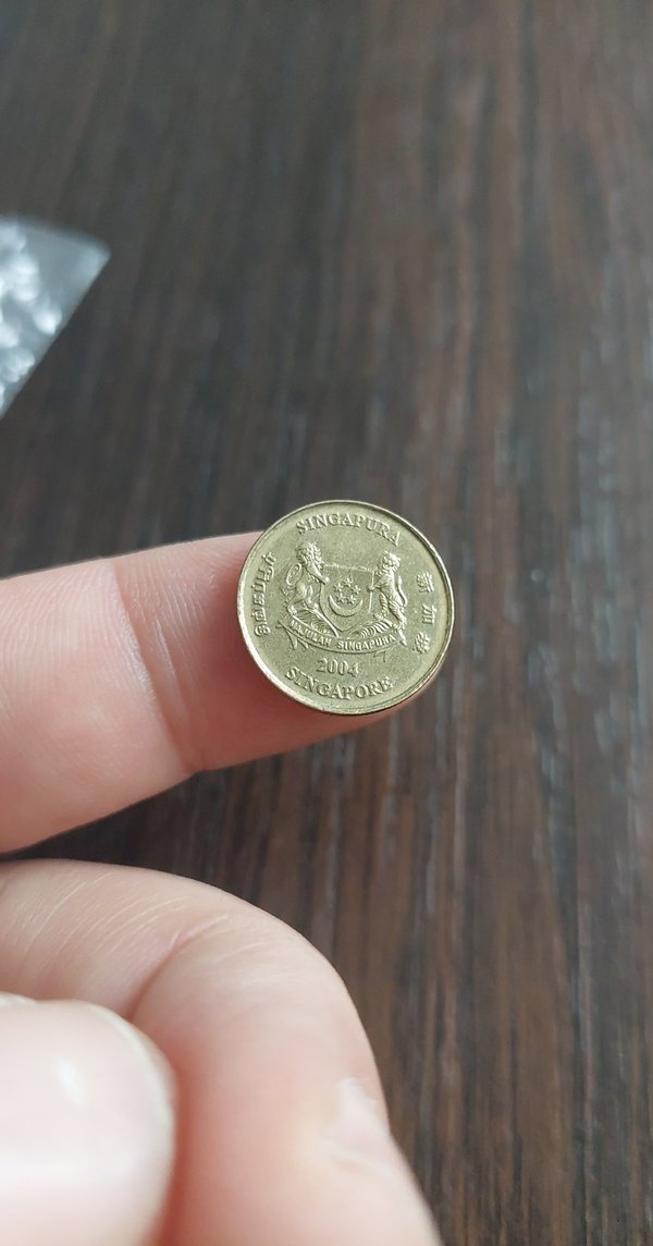Parlak altın renkli erkek rozeti, 2004 yılı ve Singapur armasıyla sade ve minimalist görünüme sahip. ✨