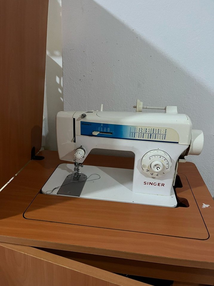 Çoklu dikiş seçenekleri ve manuel kontroller sunan beyaz Singer dikiş makinesi. az kullanıldı.