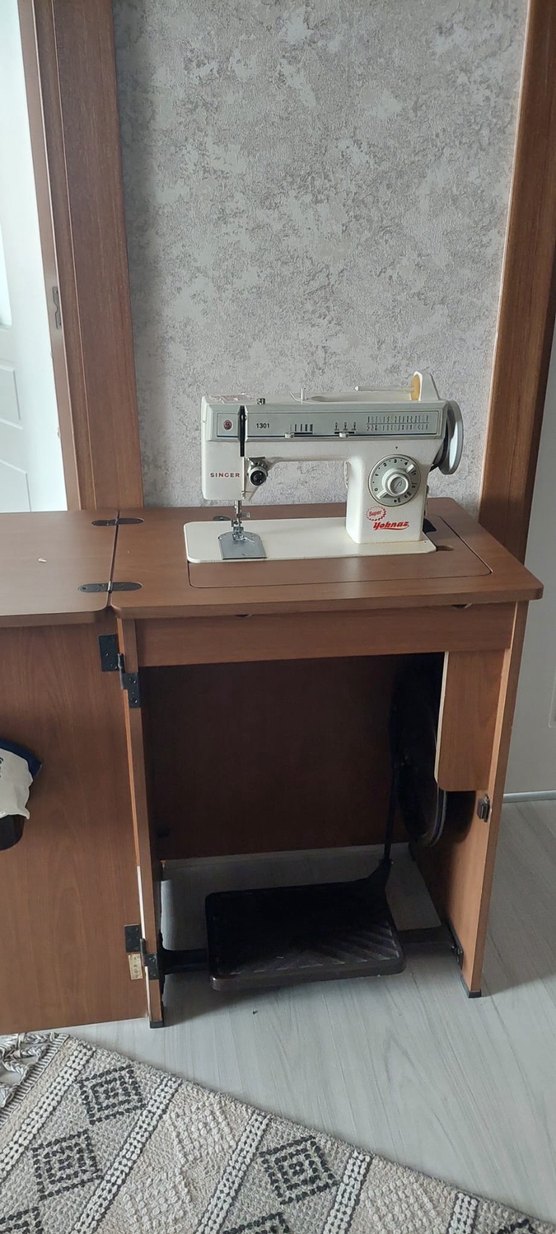 Singer piko ve dikiş makinesi, kahverengi ahşap masa üzerinde, pedal ve depolama alanı ile birlikte hem elektrikli hem ayaklı