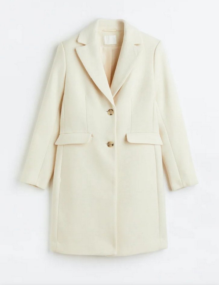 Düğmeli, krem rengi kaban. Yaka detaylı, cep kapaklı ve düzgün bir görünüme sahip. Serin havalar için uygun.