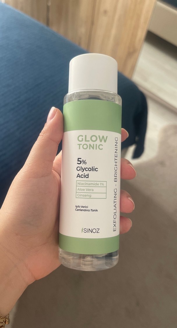 Sinoz Glow Tonic, %5 glikolik asit, %1 niasinamid, aloe vera ve ginseng içerir, cildi eksfoliye edip aydınlatır.
