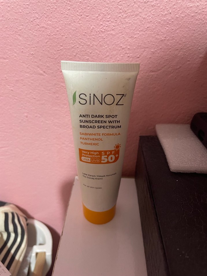 Sinoz SPF 50 güneş koruyucu krem, geniş spektrum koruma sağlar. Zerdeçal ve panthenol ile koyu lekelerin görünümünü azaltmaya yardımcı olur. Sabwhite formülü içerir. ☀️