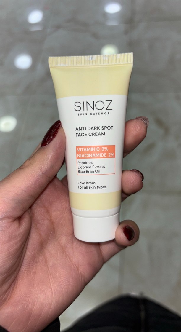 SiNOZ Leke Karşıtı Yüz Kremi, %3 Vitamin C, %2 Niacinamide, peptitler, meyan kökü özü ve pirinç kepeği yağı içerir. Tüm cilt tiplerine uygundur.