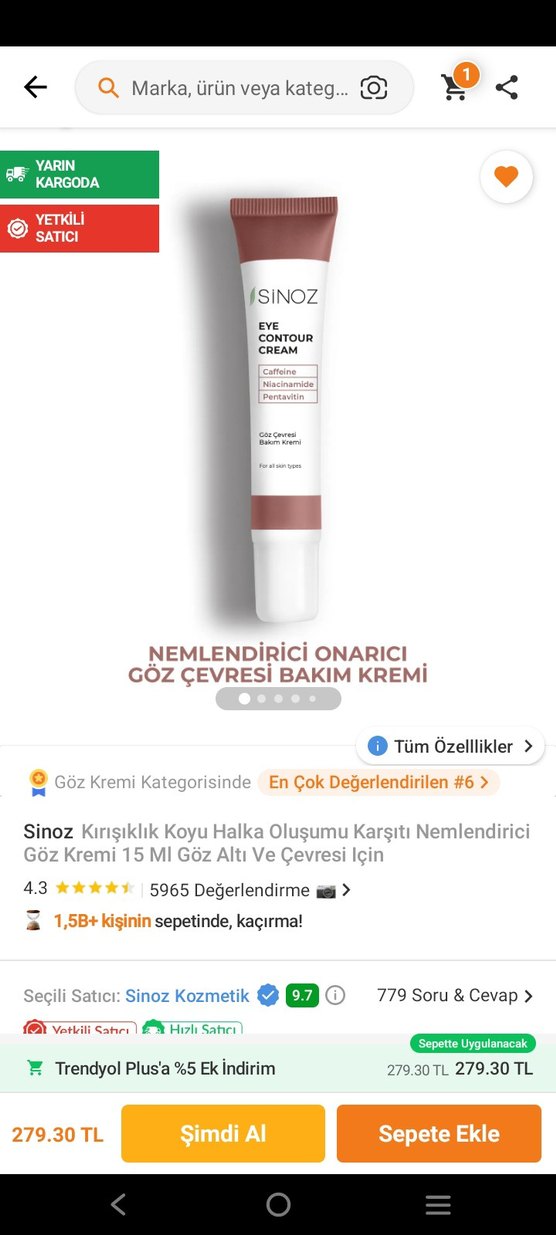 Sinoz nemlendirici ve onarıcı göz çevresi kremi, kırışıklık ve koyu halka oluşumuna karşı etkilidir. Kafein, niasinamid ve pentavitin içerir. 15 ml.