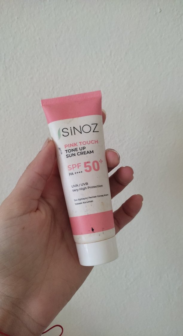 Sinoz Pembe Tonlu Güneş Kremi SPF 50, çok yüksek UVA/UVB koruması sağlar. Cilde hafif pembe ton ve pürüzsüzlük verir. yarısına kadar kullanildi