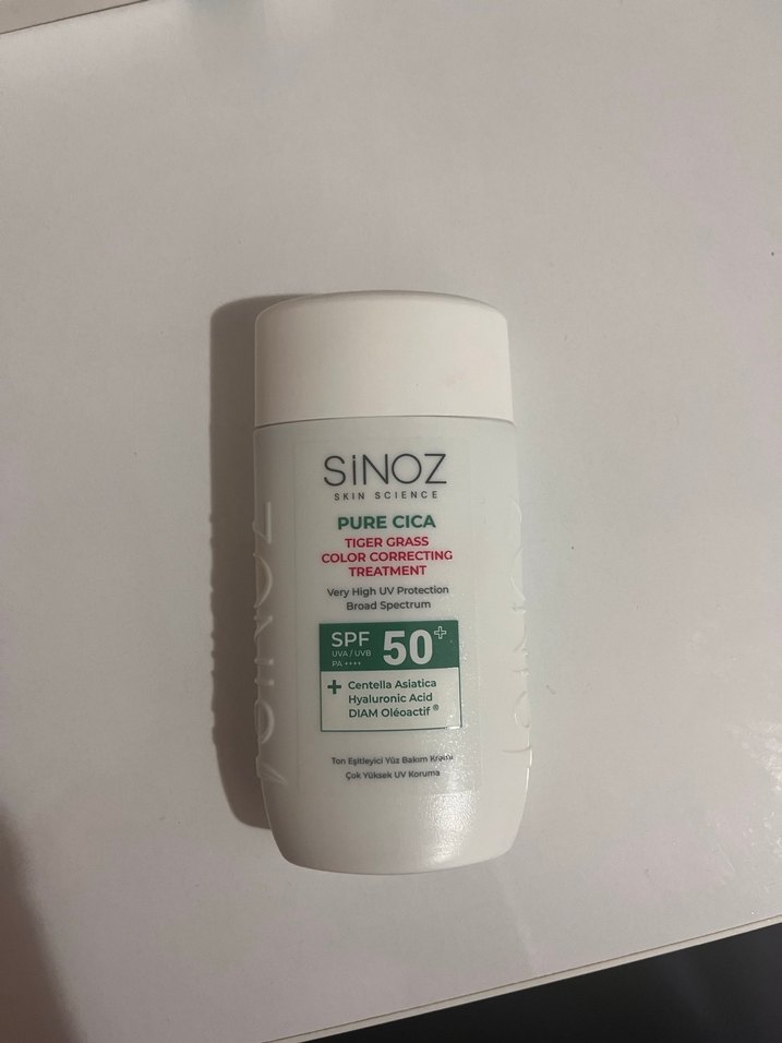 Sinoz Pure Cica renk düzeltici güneş kremi, SPF 50 ile çok yüksek UV koruması sağlar. Centella Asiatica ve Hyaluronik Asit içerir. Açık tenliyim rengime pek uygun gelmedi bi kez kullandım bakmak için buraya eklemek için de bi kez fotoğraftaki gibi kullanıldı. Geri iade edemediğim için kaldı.