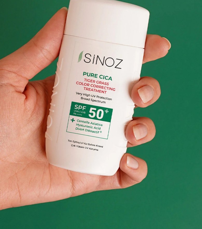 Sinoz Pure Cica renk düzeltici bakım kremi, SPF 50 ile çok yüksek UV koruması sağlar. Kaplan otu, centella asiatica ve hyaluronik asit içerir. Geniş spektrumlu koruma sunar. ☀️