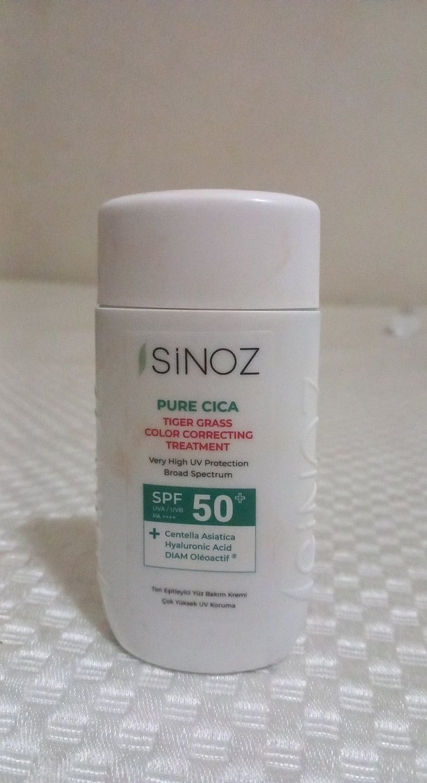 Sinoz Pure Cica renk düzeltici krem, Centella Asiatica, hyaluronik asit ve tiger grass içeren SPF 50 geniş spektrumlu çok yüksek UV koruması sağlar. ☀️