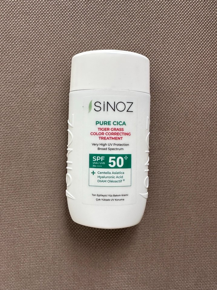 Sinoz Pure Cica, SPF 50 ve geniş spektrumlu UV koruması sunar. Kaplan otu, centella asiatica ve hyaluronik asit içerir, cilt tonunu düzeltir ve nem sağlar. Hiç kullanılmadı ton uyumsuzluğu nedeniyle satıyorum.