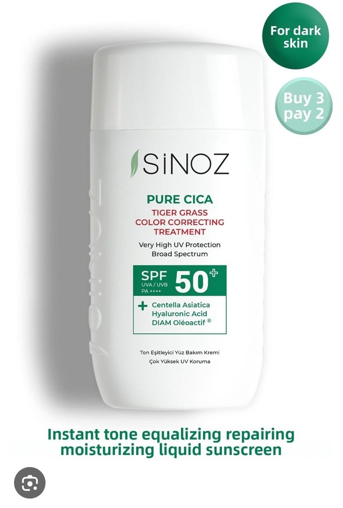 Sinoz Pure Cica SPF 50+ içeren, nemlendirici sıvı formda renk düzeltici ve onarıcı güneş kremidir. Koyu ciltler için ton eşitleyici ve çok yüksek UV koruma sağlar.