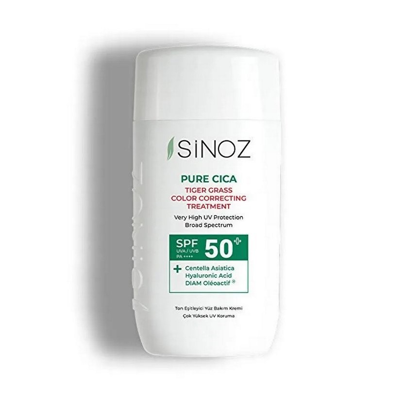 Sinoz Pure Cica SPF 50+ çok yüksek geniş spektrumlu UV koruması sağlar, hyaluronik asit ve centella asiatica içerir, cilt bakımı ve renk düzeltici etkisi vardır.