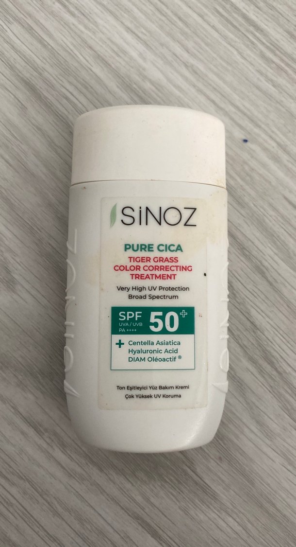 SiNOZ Pure Cica yüz kremi, SPF 50+ ile çok yüksek UV koruma sağlar, Centella Asiatica ve Hyaluronik Asit içerir, cilt bakımı ve renk düzeltme etkisi sunar.
