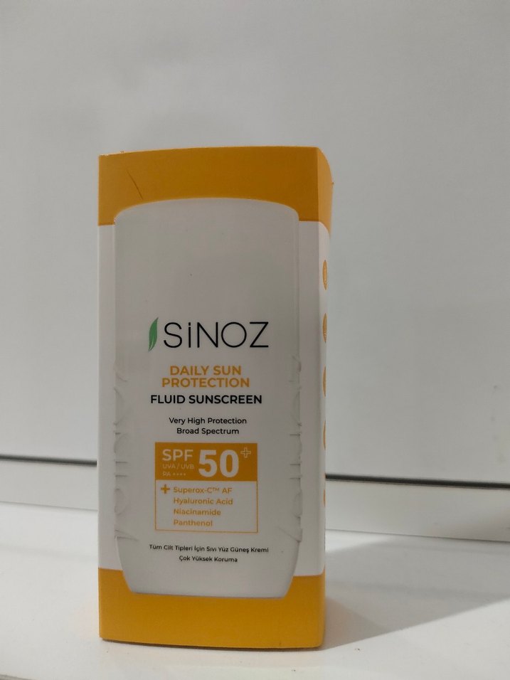 SiNOZ günlük kullanım için SPF 50 çok yüksek koruma sağlayan sıvı güneş koruyucu kremdir. Hyaluronik asit ve niasinamid içerir.