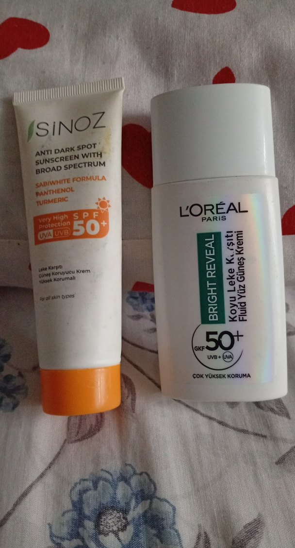 Sinoz SPF 50+ lekeleri önleyen geniş spektrumlu güneş koruyucu ve L'Oréal Paris Bright Reveal SPF 50+ yüksek korumalı.. yarıdan az vardır içlerinde 1 ay kadar rahat kullanılır denemek amaçlı alınabilir