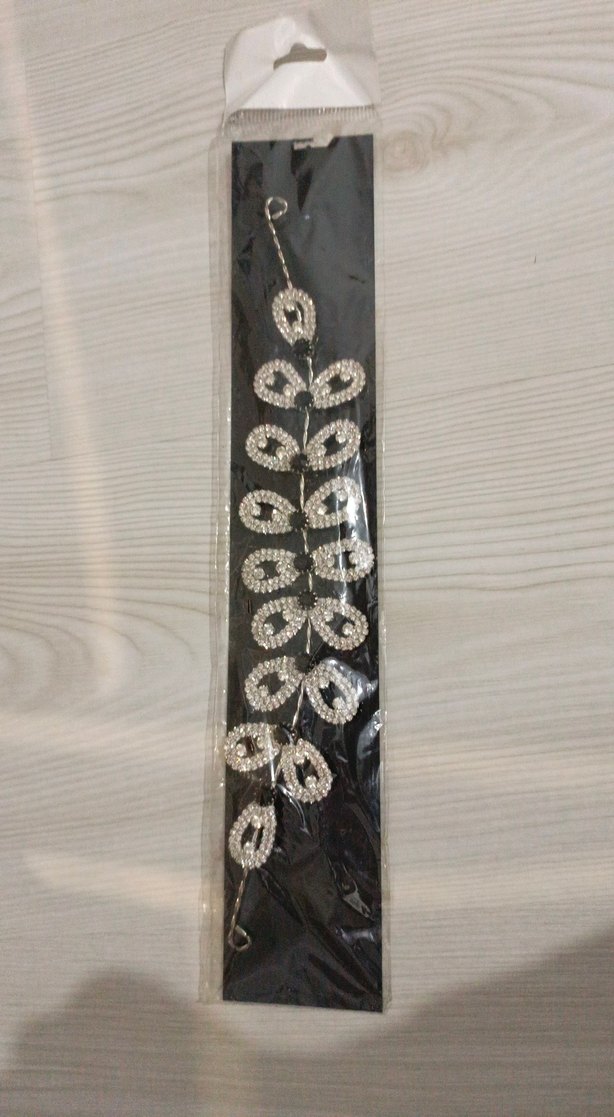 Beyaz metalden yapılmış saç aksesuarı, sıra taşlı yaprak desenleriyle klasik ve gösterişli bir görünüm sağlar. ✨
