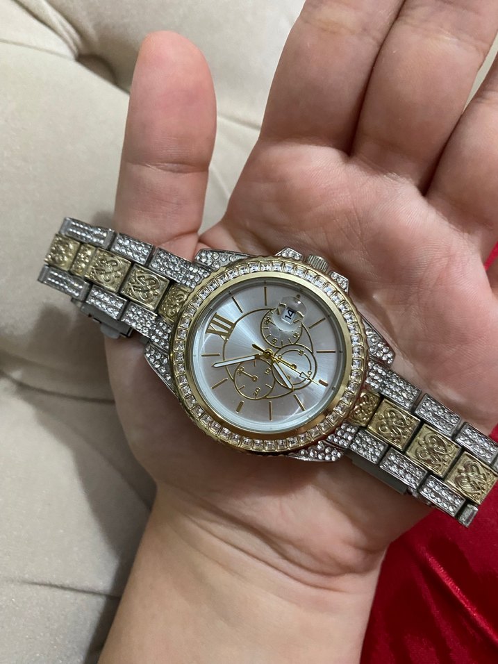 Kadın kol saati, parlak altın tonları ve bilezik ile kadran çevresinde sıralı taş detaylarıyla modern klasik ve ışıltılı bir görünüm sunar. ⌚