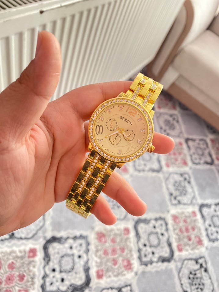 Altın renkli, sıralı taş detaylı kadın saati. Metal kordonlu, renkli ve gösterişli sokak stili tasarımıyla dikkat çekiyor.⌚