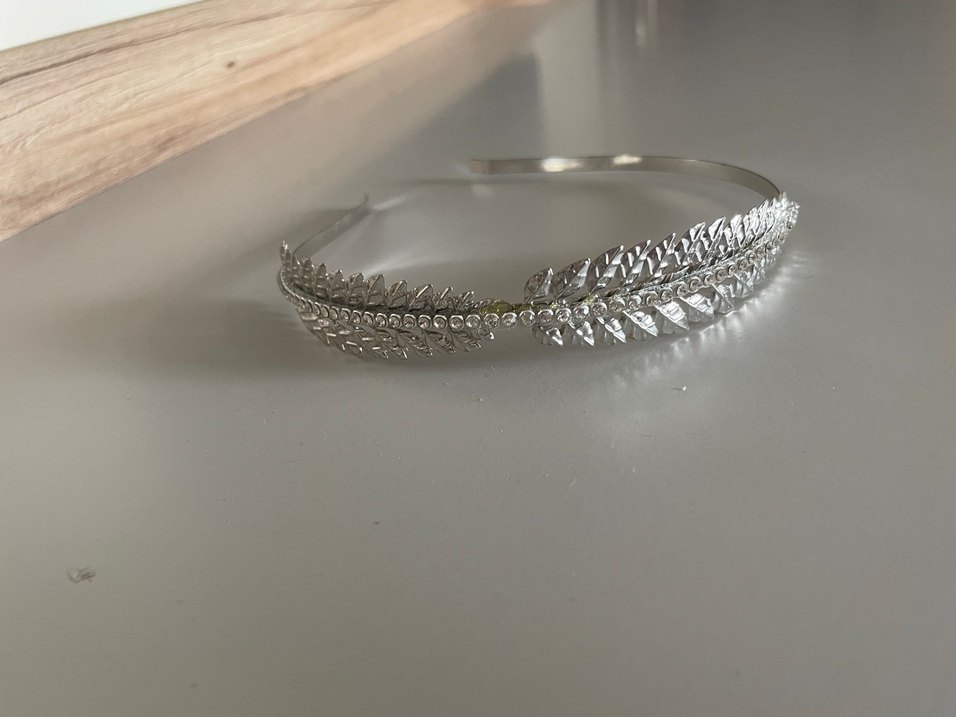 Gri tonlarında sıralı taşlı yaprak desenli metal saç aksesuarı, klasik zarafeti yansıtır. Gümüş helen tacı sıfır ürün
