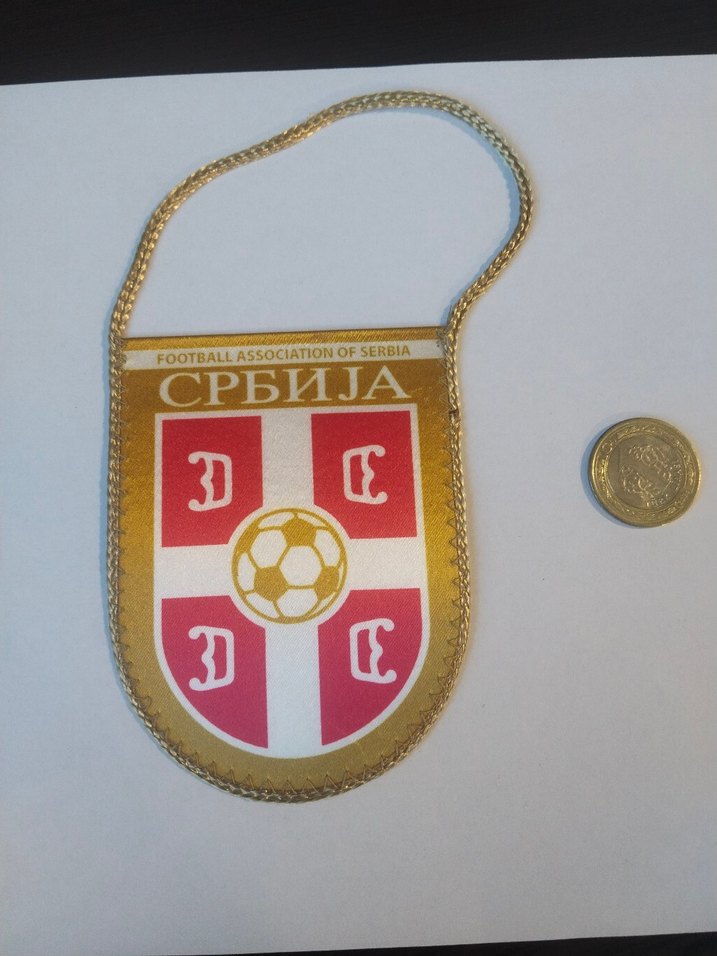 Parlak altın renkte, eski tarz erkek futbol . Üzerinde Sırbistan Futbol Federasyonu amblemi ve 'СРБИЈА' yazısı bulunur. Zincir askılıdır. ⚽