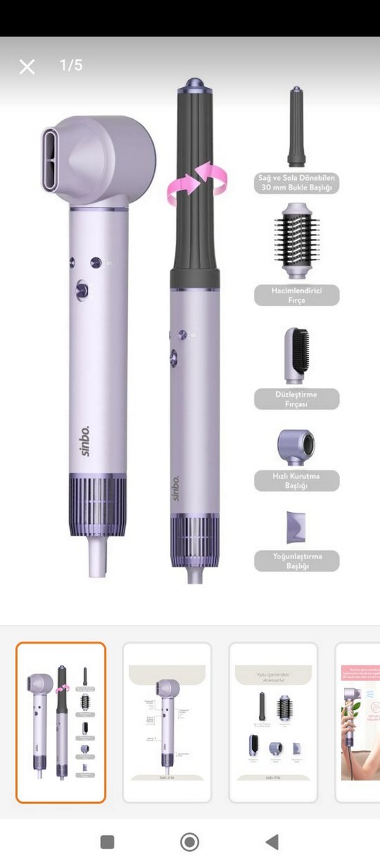 Sirbo mor saç şekillendirici, sağ ve sola dönebilen 30 mm bukle başlığı, hacimlendirici ve düzleştirme fırçası, sıcak hava kurutma ve yoğunlaştırma başlıkları ile birlikte gelir. ♀️ kutusu yok alalı 4 ay oldu hiç kullanmadım