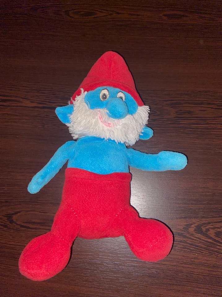 Mavi renkli, kırmızı şapka ve pantolonlu yumuşak peluş oyuncak, oyun ve dekorasyon için uygun.