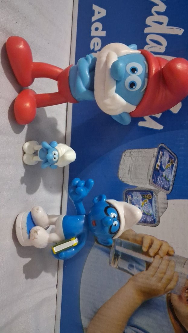 şirin baba ve şirin İki adet renkli mavi Şirin figürü, biri kırmızı şapka ve ayakkabılı, diğeri küçük beyaz şapkalı, detaylı ifadelerle.