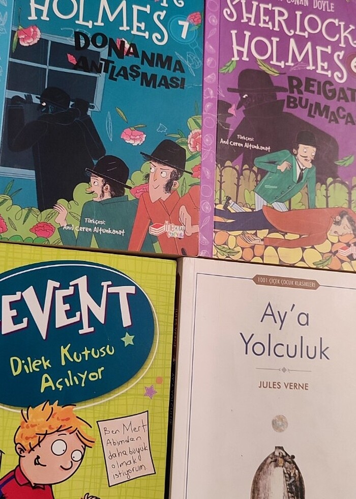 Hepsi temiz.Sıfır alındı. Tek kişi okudu. Sadece birine bi şey dökülmüş. Son fotolarda var. Okumaya engel değil. Şirin 30 tl Atasözleri 60 tl(ikisi) Sherlock Holmes 100 tl (ikisi) Aya Yolculuk 30 tl Levent 30 tl Beyaz Diş 20 tl Annem Neden Çıldırdı 40 tl Toplam 9 kitap. Hepsini alana 250 olur. SON FİYAT