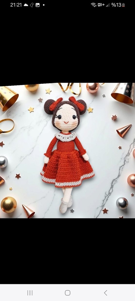 Detaylı el örgüsü kırmızı elbise ve saç aksesuarlarına sahip renkli örgü bebek.