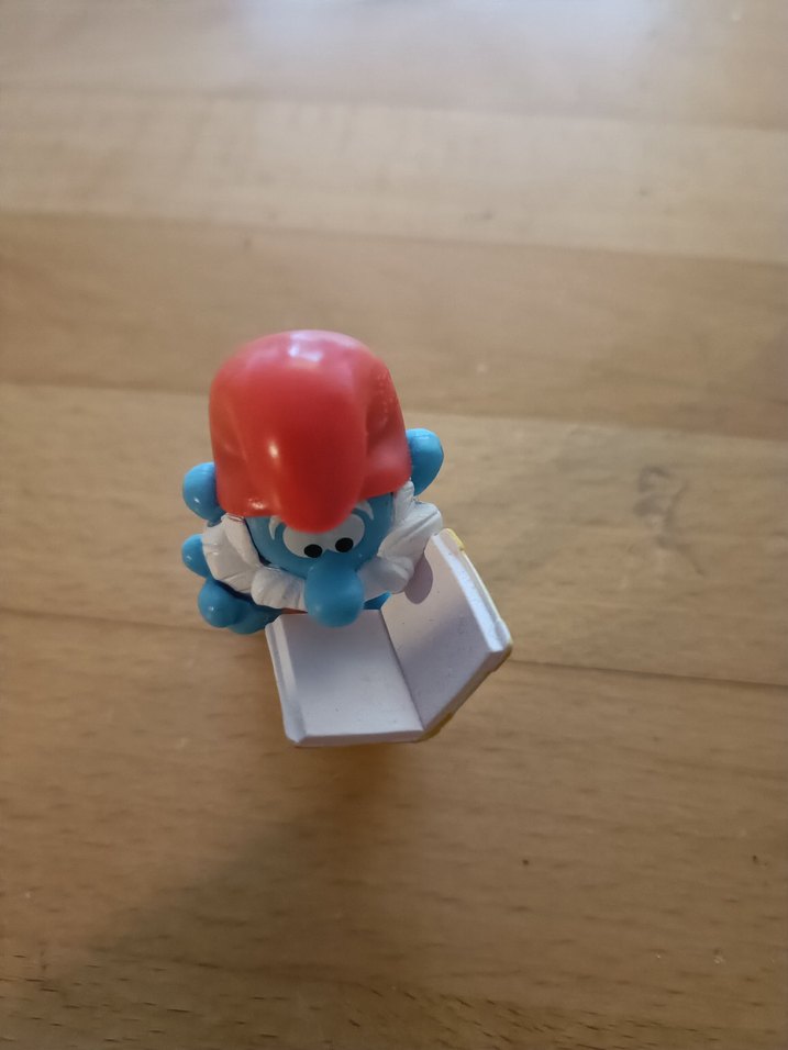 Şirinler, Şirin Baba. Şirinler serisinden pastel mavi renkte, kırmızı şspkalı küçük ve ayrıntılı bir figür. Karakter, elinde kitap tutuyor ve orijinal animasyonun cazibesini yansıtıyor.