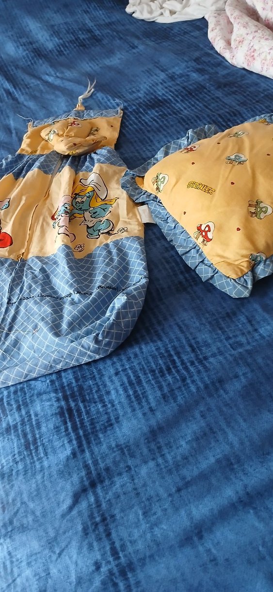 Mavi sentetik kumaştan, renkli nakışlı desenlere sahip çocuk uyku setidir. Yastık ve çizgi film desenli uyku tulumunu içerir. ️