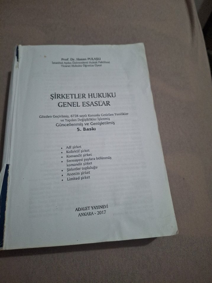 Prof. Dr. Hasan Pulat'ın 5. basım şirketler hukuku kitabı, genel esasları ve hukuki kavramları içerir. sadece kapagi yok sayfalar tam, ici temizdir