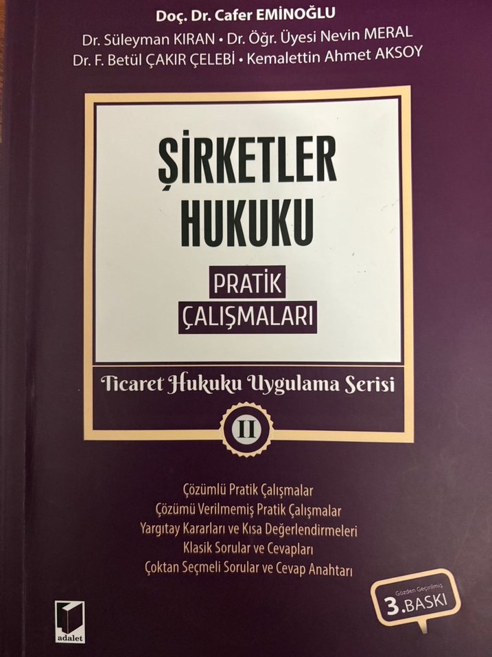 Şirketler hukuku üzerine çözümlü ve çözümü verilmemiş pratik çalışmalar, Yargıtay kararları, klasik sorular ve çoktan seçmeli soru cevap anahtarı içerir. Çok az sayfalı çizili