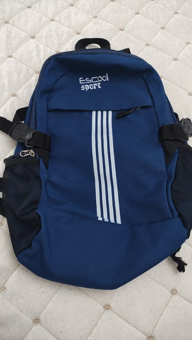 Ön fermuarlı cep ve yan file cepleri olan koyu mavi sırt çantası. Önünde 'Escool spert' yazısı bulunur. Ayarlanabilir askılar mevcuttur. yazılar silindi görüldüğü üzere