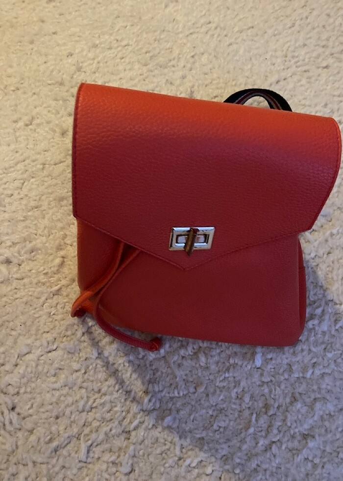 Kırmızı suni deri çanta, askıları yeşil, kırmızı, bej çizgili, klips düğmeli. Hemen klips in yanı görünmeyecek şekilde bir kusuru mevcut ama kesinlikle tamir edilebilir