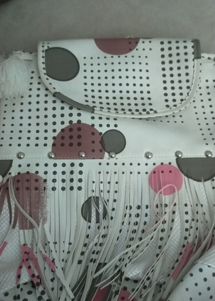Bir kac kez kullanılmış yırtığı yok hoş desenli sırt çantası püsküllü detayı var tek bölümlü içi geniş çanta.