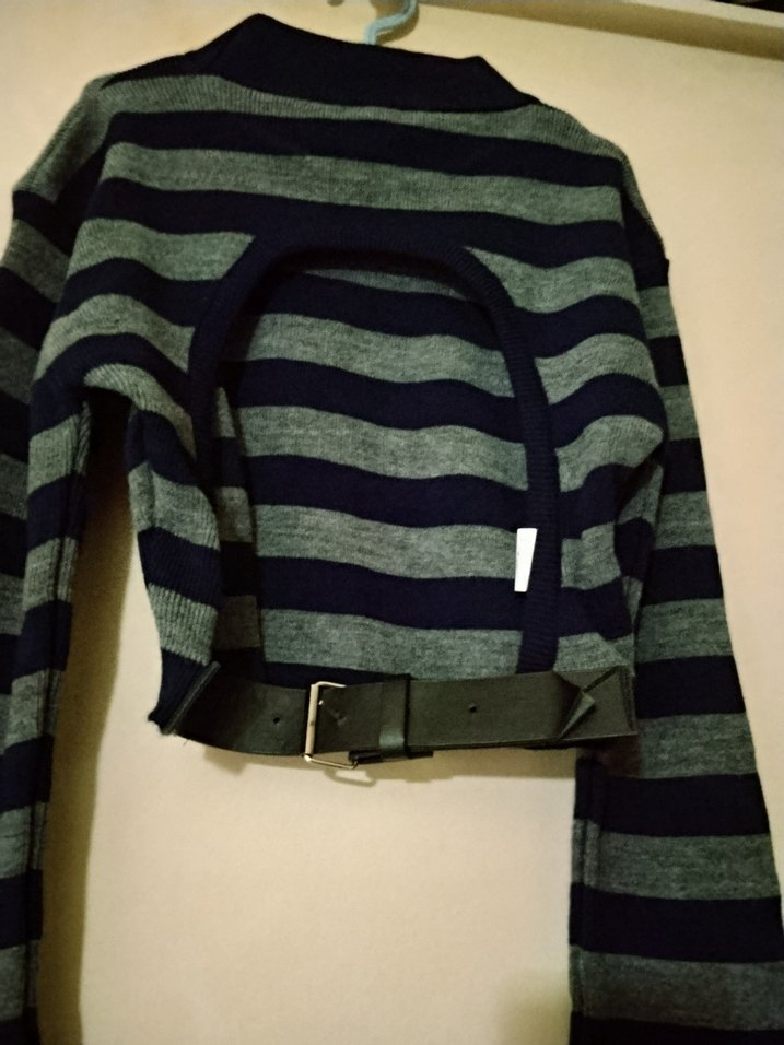 Tokalı kemerli, balıkçı yakalı, askılı kollu, çizgili gri triko, sokak stiline uygun, midi boyda ve günlük sırt dekolteli crop kazak