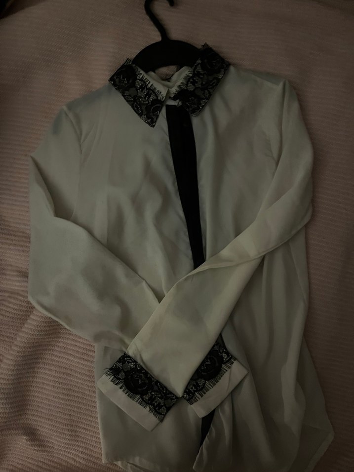 sırt dekoltelidir detaylı yakası ve manşetleri olan, düğmeli, uzun kollu beyaz kadın gömleği. İpeksi kumaştan, ofis için uygun, sade ve şık.