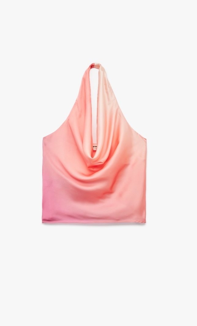 Kadınlar için pembe pastel tie-dye desenli, ipeksi dokulu ve drapeli tasarıma sahip çağdaş stilde minimalist tote çanta. Günlük kullanıma uygun.