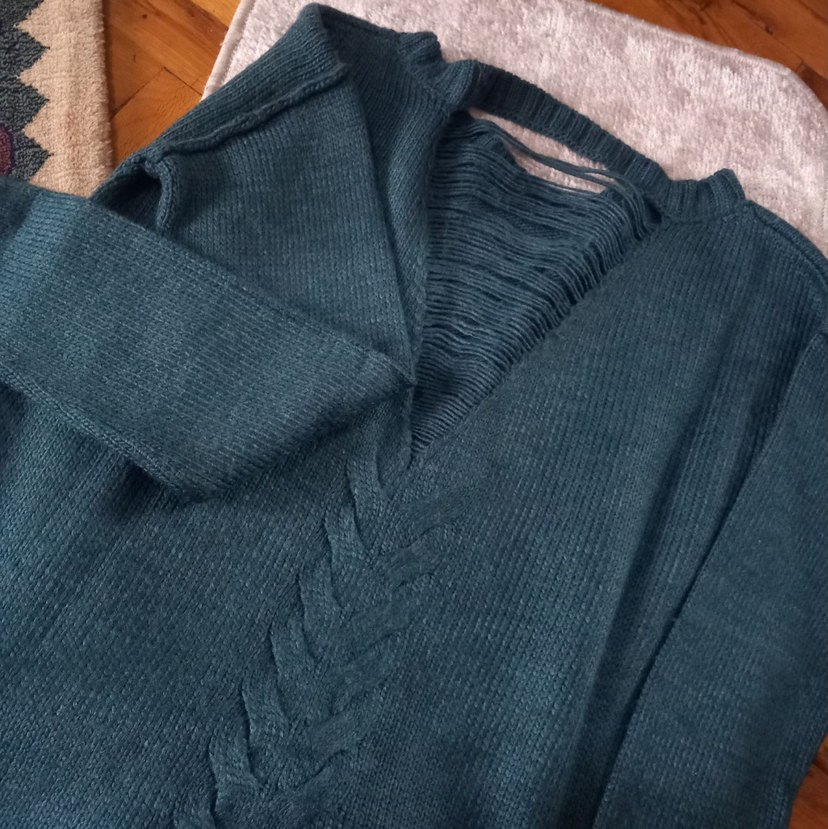 Gri renkli, V yakalı, uzun kollu örgü kadın kazak. Salaş kesim ve bohem tarzıyla günlük kullanıma uygundur.