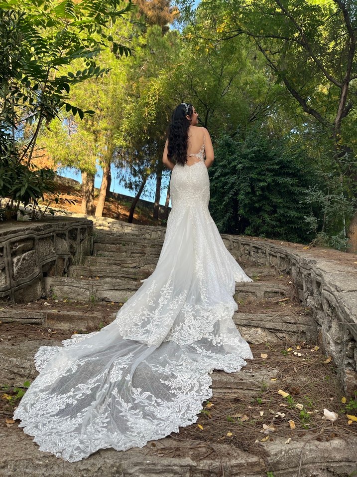 İnce askılı, derin v yakalı, uzun kuyruklu balık gelinlik. Yalnızca nikah ve ardından çekimde kullanıldı. Simli nakışlı ve dantelli detayları var 38-40 bedene uyumlu