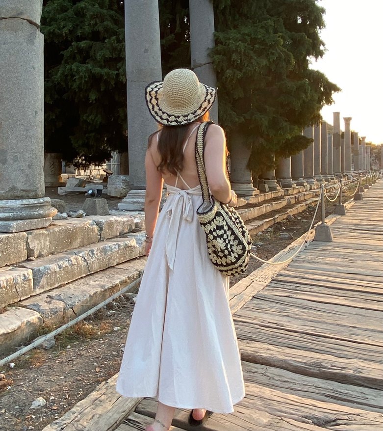 Beyaz keten,sırt detaylı uzun elbise. Askılı, dekolteli ve bol kesimdir. Günlük kullanıma uygundur.Marka temsilidir.