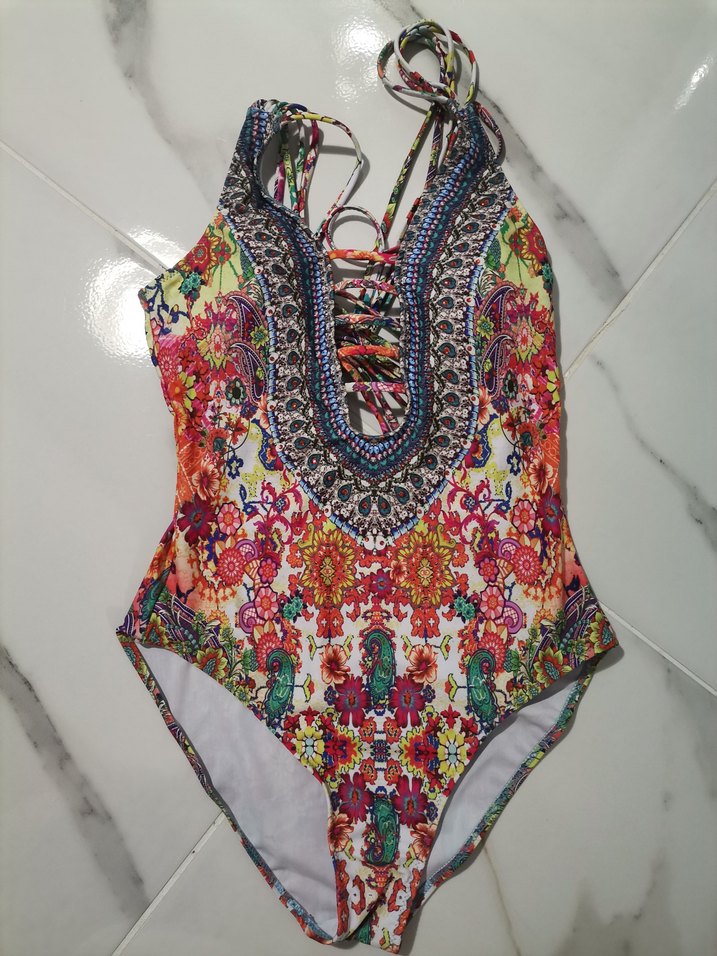 Sırt detaylı, çok renkli bohem desenli, askılı ve vücuda oturan mayo. Midi boyda, plaj için uygun renkli tasarım.