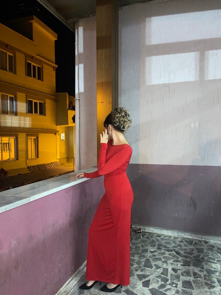 uzun kollu ve Sırt Detaylı, vücuda oturan kırmızı uzun elbise. Cesur ve çağdaş stil için yırtmaç detaylı, romantik akşamlar için uygun.