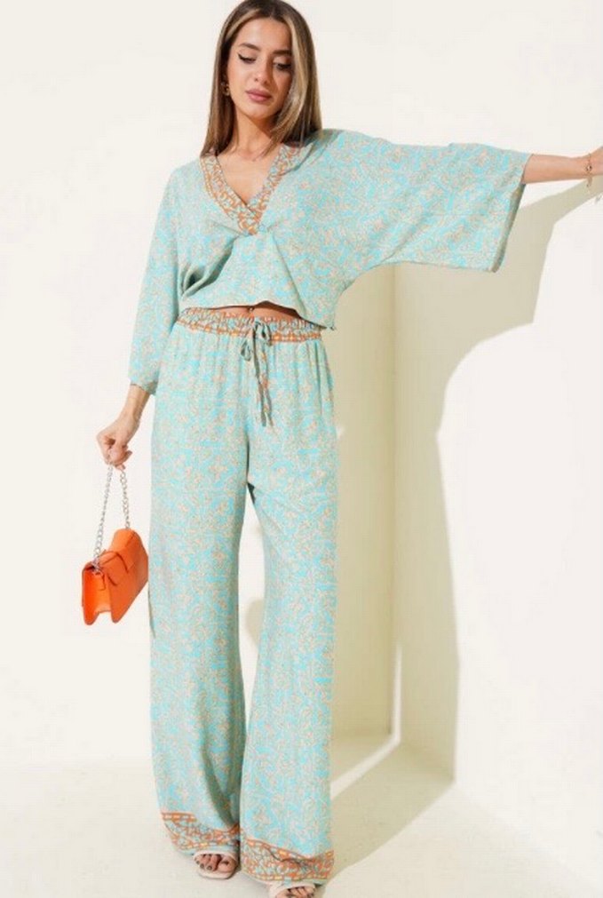 Sırt İp Detaylı Desenli Crop İkili Takım Petrol