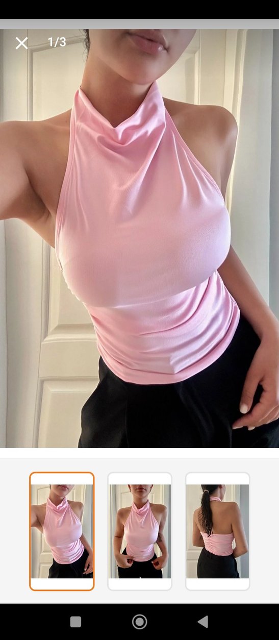 Pudra pembesi, drapeli ve yüksek yakalı, ince kesimli, ipeksi dokuda kadın bluz.