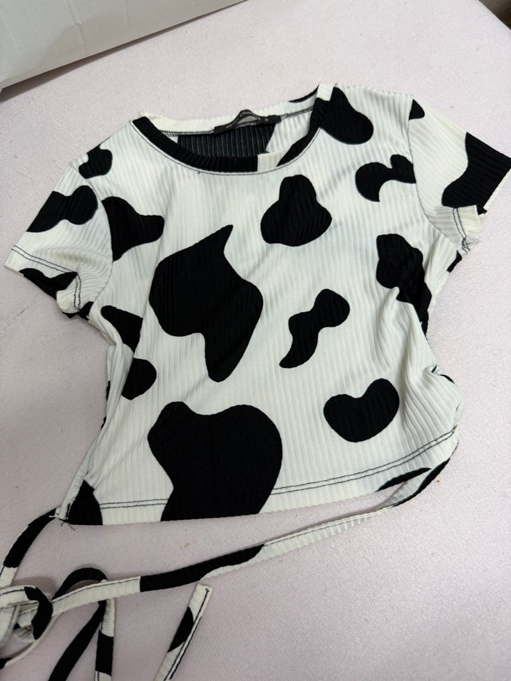 Kısa kollu, yuvarlak yakalı, siyah beyaz desende, yumuşak örme sentetik kumaştan, kısa kesim, bağlamalı crop