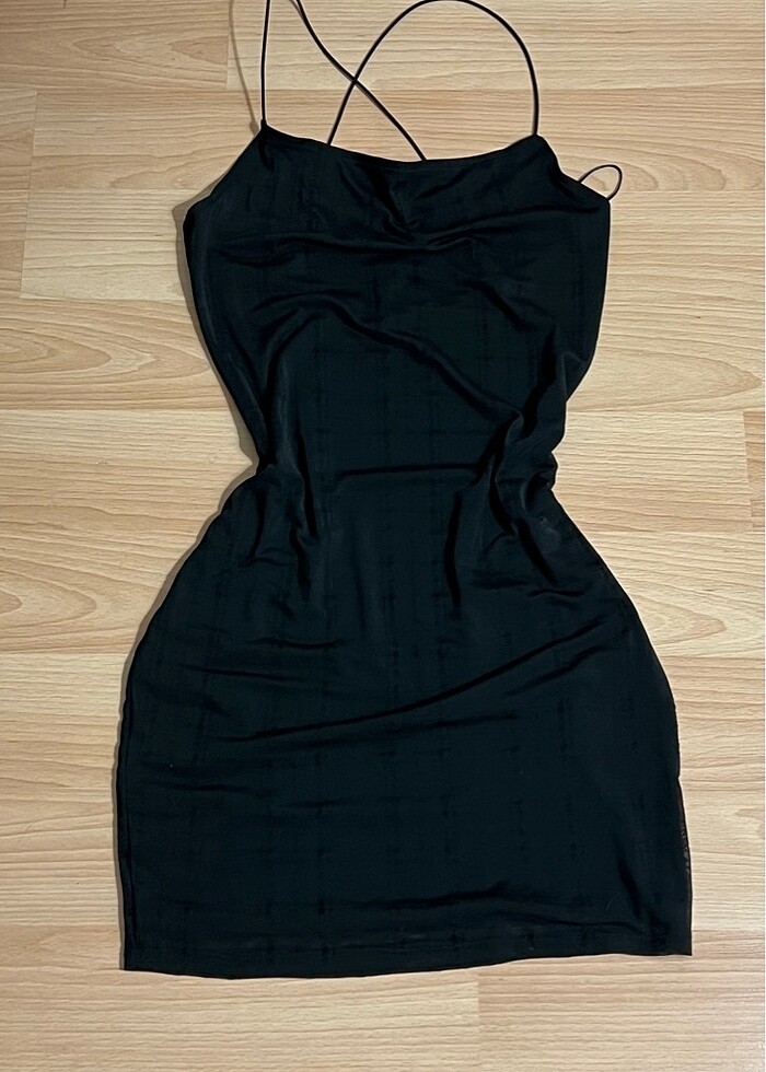 sırtı acım siyah çapraz askılı mini elbise