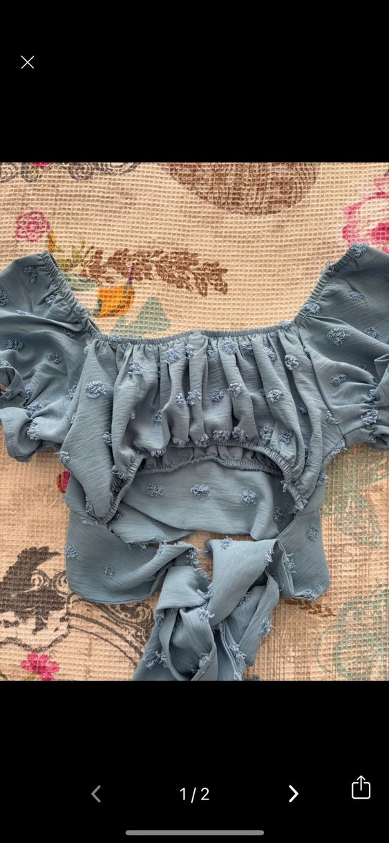 Nakışlı detaylara ve fırfırlı aksanlara sahip, gri renkli, kısa ve vücuda oturan bluz. Kayık yaka ve askılı kollarıyla bohem tarzı yansıtıyor.