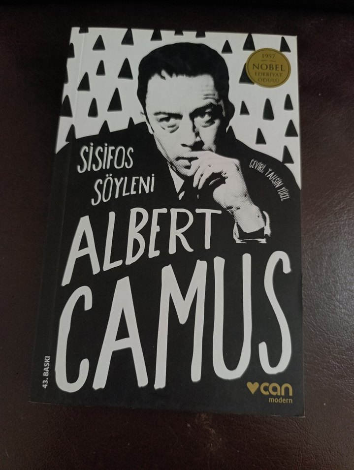 Albert Camus'un Sisifos Söyleni, felsefi temaları modern bir yaklaşımla ele alıyor. Kapakta yazarın portresi ve Nobel Ödülü detayı bulunuyor.